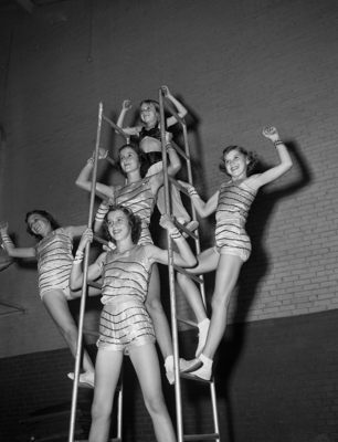 Five girls from the North Side Recreation Building are shown as they practice a Roman Ladder act for the recreation department's 20th annual circus. Center, top to bottom, are Sue Grove, Jerry Lee Adle, and Alice Grove. Jessie Harwell is at the left, and Mary Grove is at the right. The three Grove sisters would also do a hand-balancing act. Published in the evening edition, August 15, 1950.