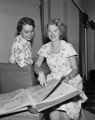 Visiting Texas, Lili-Ann Strandus, right, is shown pointing out her home town of Stockholm, Sweden. Next to her stands Dr. Mary Ann Pruitt, of 2214 Hamphill. The women became friends when both attended the Palmer school of Chiropractic at Davenport, Iowa. Published in the evening edition, August 10, 1950.