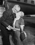 Image shows Reverend J. Frank Norris getting a goodbye kiss from his wife, Mrs. Norris, before he boarded an American Airlines plane at Meacham Feild, as he headed for a tour of Europe and the Middle East. The reverend planned to attend the International Council of Churches in Geneva. Published in the evening edition, August 8, 1950.