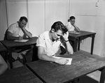 U.S. Selective Serviceman, William E. Roach, of 1101 East Peach, is shown gazing at his Armed Forces Qualification Test paper during the draftees' psychological examination. Two other draftees are visible sitting in the background pondering their own exams. Published in the morning edition, August 10, 1950.