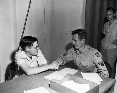 U.S. Selective Serviceman Eugene Wiley, left, of 2528 Honeysuckle, is shown shaking hands with Sergeant Andrew Klith, right, after learning that he passed is draft physical and psychological tests. Published in the morning edition, August 10, 1950.