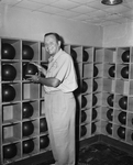 Chicago's Junie McMahon chooses ball at Tavener's Playdium, where he shot a 661, teaming with Garner Wells to beat Will Craig and Don McDaniel in an exhibition match. Published in Fort Worth Star-Telegram, morning edition August 18, 1950.