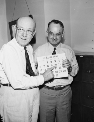 John Alderman of Lubbock, left, is shown pointing to the date August 10, on which he retired as chief federal probation officer for the Northern District of Texas. Holding the calendar on the left side of the image is Elmer Reed, the new chief federal probation officer. Published in the morning edition, August 11, 1950.