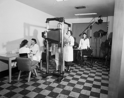 Members of a Fort Worth-Tarrant County Tuberculosis Society X-ray machine crew demonstrate how they will examine the chests of all open class Golden Gloves boxers this year. Checking blood pressure at left is Miss Maxine Graham, while Mrs. Irene McCall, center, and Mrs. Laverne Beaty take charge of the x-ray machine.
