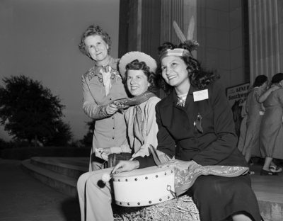 Mrs. Scott Wickham, center, of Bluefield, West Virginia, and Mrs. Leola Sechoya McGilbart Taylor, right, a half Creek elementary school teacher from Springtown Oklahoma, are shown taking a break during the Delta Kappa Gamma barbecue, while Miss Elsie Moses, Oaklawn Elementary principal, ties a handkerchief around Mrs. Wickham's neck. Published in the morning edition, August 11, 1950.