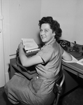 Image shows Mrs. Mary Warren, the widow of Police Officer J. M. "Jimmy" Warren. Mrs. Warren is shown at her new job, working a secretary to Police Captain Dysart in his new post as full-time director of the Fort Worth Emergency Board to plan civilian defense. This was her first job since her husband died with two of the couple's three daughters of burns suffered when flames engulfed their home at 2509 Pearl in February of the same year. Published in the morning edition, August 11, 1950.