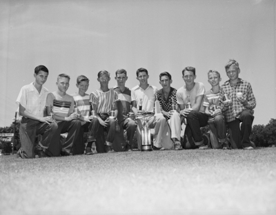 Here are the winners in each flight of the city junior golf championship, completed at Sycamore. Left to right, Michael Taylor (9th), Robert Sykes (8th), Tiny Evans (5th), Don Ezzell (4th), Johnny Gipso 91st), Don Matheson (championship), Jerry Hooks (2nd), Leon Duffey (3rd), George McKeown (6th), and Charles Stringer (7th). Matheon defeated Jerry Edwards in the championship finals, 3-2, in the annual affair for the Fort Worth youngsters. Matheson also won the medalist trophy. Published in Fort Worth Star-Telegram, morning edition August 18, 1950.