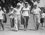 Don Matheson, left, and Jerry Edwards, finalists in the city junior golf tournament, forget pars for a moment in their match at Sycamore. Don beat Jerry, 3 and 2, for the title. Published in Fort Worth Star-Telegram, morning edition August 12, 1950.
