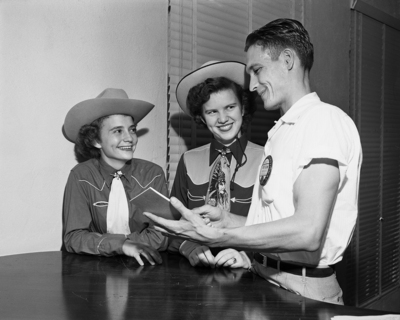 17-year-olds, Miss Lena Mary Scully of 2508 Yucca, left, and Miss Helen Spurr, of 216 North Judkins, right, are shown as they register with Grady Clark at the Riverside Lions Club luncheon for entrance in the western queen contest. The contest was to be held as a part of the club's fourth annual carnival, held in Sylvania Park. Published in the morning edition, August 12, 1950.