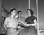 Two air cadets from Switzerland attended the 17th National Soaring Contest at Grand Prairie. The two cadets, are shown presenting Mrs. Emmadean Berry with a Swiss flag. Left to right are Cadets Oskar Scherrer and Erich Nacht, and Mrs. Berry, a native of Bowie, and manager of the Grand Prairie Chamber of Commerce. Published in the evening edition, August 11, 1950.