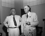 The image shows General Carl Spaatz, left, standing next to E. H. Hereford. The General can be seen holding in a cigar in his hand as the two men converse.