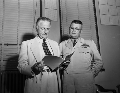 The image shows General Carl Spaatz, left, standing next to Major General Lucus V. Beau. The General can be seen reading, while the major general looks on.