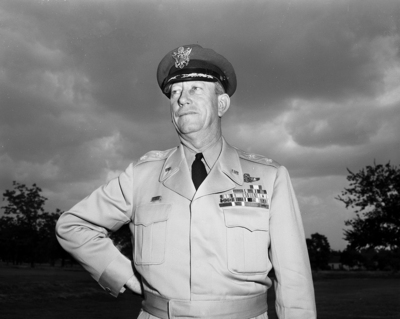 The image shows Major General Earl S. Hoag. General Hoag stands at the center of the image with one arm bent, hand at his hip, with wildlife visible in the background. Published in the morning edition, August 13, 1950.