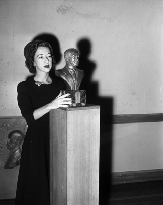 Electra Waggoner Biggs, member of a Texas pioneer family, is in Fort Worth to exhibit her sculpture at the Public Library under sponsorship of the Fort Worth Art Association. At left, she is shown placing a sculpture of her father, E. P. Waggoner on a stand. She has worked out a happy combination of career and family life, in that she uses members of her family as models.