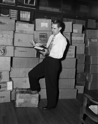 County School Superintendent O. H. Stowe is shown examining a few of the thousands of new textbooks which were being sorted for distribution to county schools. Ranging from primary reading to advanced mathematics. Published in the evening edition, August 14, 1950.
