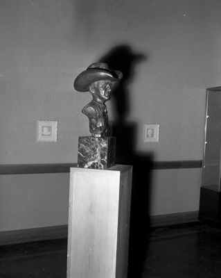 Electra Waggoner Biggs, member of a Texas pioneer family, is in Fort Worth to exhibit her sculpture at the Public Library under sponsorship of the Fort Worth Art Association. At the exhibit is a bust of Tony Hazelwood, ranch foreman at Santa Rosa, where Mrs. Biggs lives and maintains her studio.