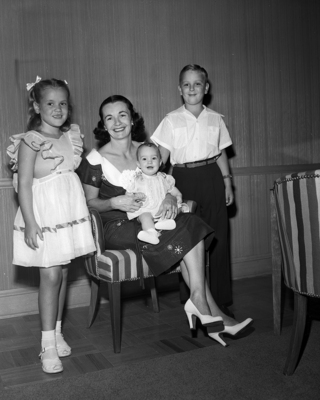 Mrs. H. Fuller Stevens, center, sits with her children, Patty, left, 7; David, right, 8; and Cathy, seven months. The family had recently moved to Texas with Mr. Stevens to live in a Southern Colonial home in Westover Hills. Published in the morning edition, September 3, 1950.