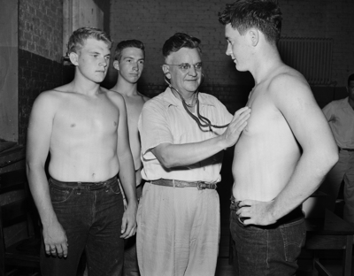 Dr. I. P. Barrett, is shown checking football high-school football player Jack Thomas, right, at Handley High School, on the opening day of training. To the left stands Roy Murray, a tackle, and Don Hughes, team captain, waiting their turn. Published in the morning edition, August 15, 1950.