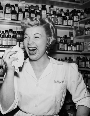 Image shows Betty Bell, of 317 Haynes, smiling, right before a sneeze, as Hay fever season comes to Fort Worth. Published in evening edition, August 17, 1950.