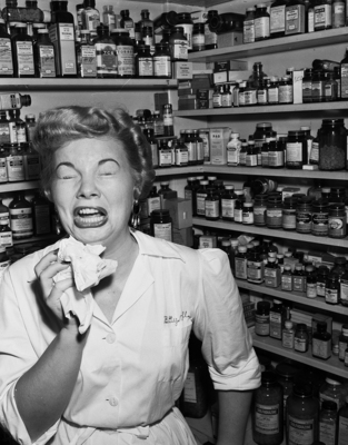 Image shows Betty Bell, of 317 Haynes, caught mid sneeze, as Hay fever season comes to Fort Worth. Published in evening edition, August 17, 1950.