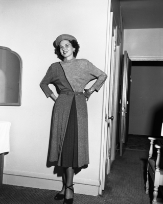 Image shows Mrs. Fran Gross modeling a Jersey Dress by International. Midwinter and holiday fashions were displayed by manufacturers at the National Fashion Exhibitors of American, held at Hotel Texas. Published in the morning edition, August 15, 1950.