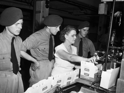 Three air cadets from England watch Mrs. Ruth Halyard of 1507 Ellis operate a machine which fills hundreds of cartons of lard daily at a Fort Worth packing plant. Left to right, the cadets are Bruce Northway, Terrence Blewitt and Alan Ginn. Published in Fort Worth Star-Telegram evening edition August 14, 1950.