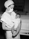 This baby will have a royal name as soon as Princess Elizabeth names her child. Mrs. H. C. Cline, a nurse at Harris Hospital, is holding the daughter of Mrs. and Mrs. E. O. Kenman of Rt. 1. Published in Fort Worth Star-Telegram morning edition August 16, 1950.