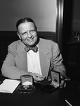 H. Ward Collier wound up a quarter of a century as recorder of Moslah Temple Shrine- 25 years in the same job but 25 different bosses. He is shown here looking sharp in a well-fitted suit and a bow tie, displaying some products. Published in Fort Worth Star-Telegram morning edition August 16, 1950.