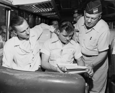 Image shows John A. Schlottman, right, state president of the American War Dads, helping Board 111's leader, Lawrence Gibbs, center, of 2317 Roosevelt, is shown checking his list of pre-induction draftees aboard a bus at the T&P Passenger Station. Jack Zimmer, left, of 2805 East Belknap, looks on. Behind them, Gus Rahr, president of the Fort Worth War Dads, stands chatting with Junior Lee Germany, of 3028 Hemphill. Published in the Fort Worth Star-Telegram evening edition August 16, 1950.