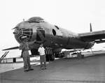 Six-year-old Robert Ede Carswell, right, son of Major Horace S. Carswell Jr., for whom Carswell Air Base is named, is shown visiting the base. Private First Class Clyde Howell, a guard on the flight line, stands to the left, showing him a B-38. Published in the morning edition, August 18, 1950.