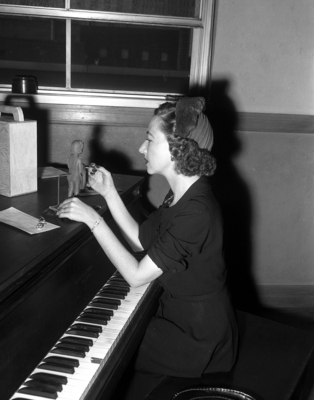 Electra Waggoner Biggs, Texas artist who will open a show in the gallery of the Public Library, does some emergency repair on a figure of her daughter, one of the models in the exhibition. She is using the piano as a desk.