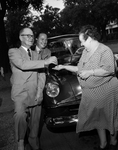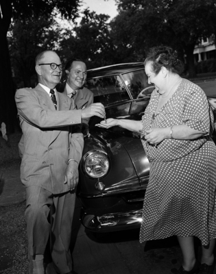 Mrs. Edna Gladney, superintendent of The Edna Gladney Home at 1315 E. El Paso, was presented with a new Kaiser automobile by P. J. Harris, left, of the Bob Fuller Motor Company, Lubbock, and Floyd V. Richardson, of Richardson K. F. Motors, Fort Worth. Published in Fort Worth Star-Telegram Gladney, Edna Browning Kahly, 1886-1961edition, August 20, 1950.