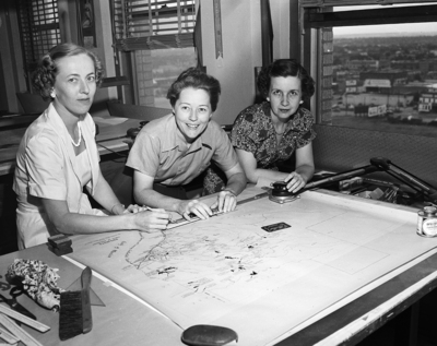 When these women at the Corps of Engineers office gather to discuss designs, it's the cut of a spillway and not a gown that interests them. Left to right, are Miss Florence Dulaney, 4433 Calmont; Miss Jacqueline Watkins, 3008 Loving, and Mrs. Anne May, 3441 Worth Hills Drive. Published in Fort Worth Star-Telegram morning edition August 20, 1950.