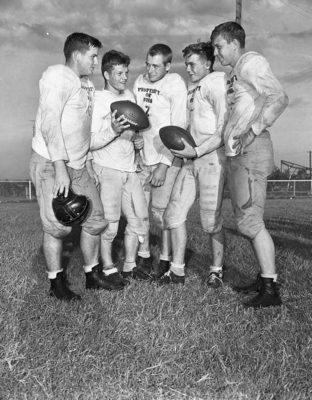 Five Birdville football lettermen start laying plans for their first game against Arlington on September 8. Left to right are Wesley Dillard, Paul Mason, Charles Pennington, Glenn McQuinn and Jack Connell. Buffs will play in 11-A this year. Published in Fort Worth Star-Telegram morning edition August 20, 1950.