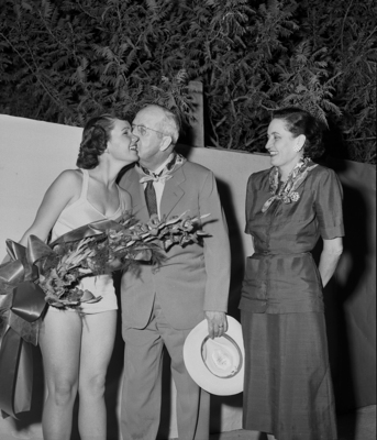 Miss Jan Pauley, left, who won her title as "Miss McCamey" when her home town celebrated its 25th anniversary. She is shown getting a kiss on the cheek from George B. McCamey, center, of Fort Worth, one of the same group who spudded in the first producing well in the area, a strike which resulted in further development in the huge Permian basin area. Mr. McCamey's wife stands to the right of the image. Published in the morning edition, August 20, 1950.
