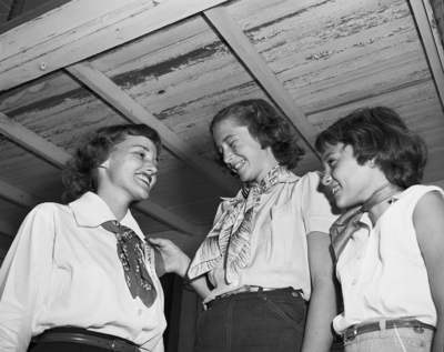 Two McCamey girls devised their own way to earn money during the silver anniversary and homecoming celebration of McCamey, by making and selling ribbons reading "McJubilee 1950". At the left, Mrs. Helen Jackson of Norman Oklahoma, is shown getting a ribbon from Peggy Jean Bonney, 12, center, and Nancy Sue Cosper, 11, right. Published in the morning edition, August 22, 1950.