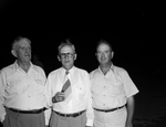 More than 325 people attended the annual barbecue supper and watermelon party given by Mr. and Mrs. F. D. Jones, owners of the Jones Hereford Ranch near Rhome. In the picture left to right are: E. L. Martin, Dallas; M. D. Willhite, Dallas, and Charles Christian, Decatur. Published in Fort Worth Star-Telegram morning edition, August 21, 1950.