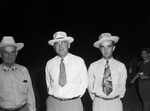 More than 325 people attended the annual barbecue supper and watermelon party given by Mr. and Mrs. F. D. Jones, owners of the Jones Hereford Ranch near Rhome. In the picture left to right are Walter Barret, Gail Dudley and Kyle Barret, all of Comanche. Published in Fort Worth Star-Telegram morning edition, August 21, 1950.