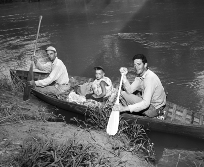 John Calvert Junior, his 9-year-old, John III and Bob Bond landed at Camp Carter after completing a 130-mile trip down the Trinity River West Fork. Published in Fort Worth Star-Telegram morning edition August 20, 1950.