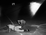 Image shows a baseball game between Fort Worth Cats and Indians. Russ Rose scores from second for Cats in the fourth innning at La Grave Field. He was called out but his left foot knocked the ball out of Oklahoma City Catcher Harold Maragon's glove. Cats won, 6-4. Published in the Fort Worth Star-Telegram morning edition, August 21, 1950.