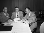 Planning the agenda for the convention of the Texas Package Stores Association at Hotel Texas are, left to right, H. A. Ammuny, Port Arthur, secretary-treasurer; J. Verne Leggett, Fort Worth, president, and Charles J. Dailey, San Antonio, vice president. Published in Fort Worth Star-Telegram morning edition, August 21, 1950.