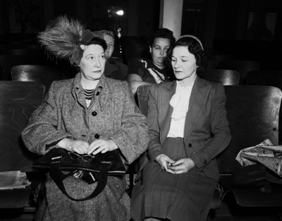 Mrs. W. H. (Bill) Mason, left, wife of slain Alice newscaster, sits with a friend, Mrs. Ed Wollard of Alice, while listening intently to arguments of state's attorneys in Belton trial of Sam Smithwick, charged with Mason's murder.