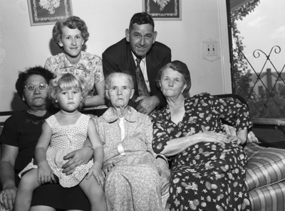 These six members, all born in an 83-year period, represented six generations at a family reunion at 509 Colvin. Standing, left to right, are Mrs. Pauline Ward and Jack Bewley. Seated, left to right, are Mrs. Kibbie Wester, Linda Fay Ward, 4, Mrs. Margaret E. Carden, 87, and Mrs. Nancy Ann Carden Hudson, 73. Published in Fort Worth Star-Telegram morning edition, August 21, 1950.