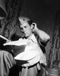 Obie D. Boyd, 25, of 1120 Lipscomb, Texas Christian University (TCU) senior, joined Marine reserves after thinking he had resigned from a Navy reserve unit. This week he had orders calling him to active duty in both services. The puzzled Fort Worth man now is sure of but one thing: he will soon be in uniform of some kind. Meanwhile, he's keeping headgear of both services handy. Published in Fort Worth Star-Telegram evening edition August 22, 1950.