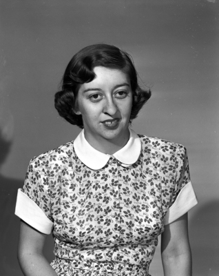 Miss Frances Banovic of Pearl River, N. Y., is visiting Mr. and Mrs. J. C. Carter, 204 N. Roe Street, for two weeks. She is photographed here in a floral patterned dress. Published in Fort Worth Star-Telegram morning edition August 23, 1950.