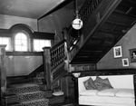 The plaster and wood-paneled reception hall of the 10-room house which, in five decades adapted itself according to its time, as people live out their span of life. The reception hall showcases stairs and a couch below the stairs. Published in Fort Worth Star-Telegram evening edition, December 15, 1950.