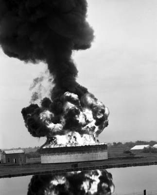 Smoke and flames-- reminiscent of the Bikini atom bomb pictures-- mushroom from a 55,000 gallon crude oil tank at the Magnolia pump station. The tank, two-thirds full of crude oil, was ignited by lightning about 4:38 a.m. Damage was estimated at $200,000. Published in Fort Worth Star-Telegram evening edition August 22, 1950.