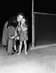 Mrs. Marie Forsgren Straley, returning after a search for a clue to her husband's fate, SSGT Mr. Neal A. Straley, is greeted here by Mary Engelke. Published in Fort Worth Star-Telegram morning edition August 23, 1950.
