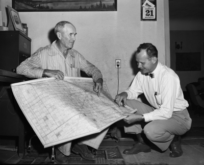 A. M. Brownfield, 74, left, a Terry County ranchman, is shown pointing out on a map where oil tests would soon be drilled on his ranch. Looking on at the right of the image is Wayne "Red" Smith, Chamber of Commerce manager. Published in the morning edition, September 10, 1950.