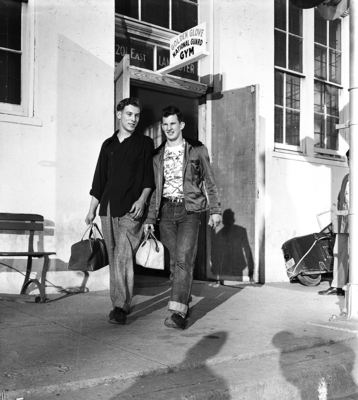 Lightweight Ronald Kitterman (left) and Bantam Dewayne Neeley, both of Tech, finish training and weight-in for regional Golden Gloves tournament. They walk side by side , each holding a bag in their hand while the sign 'Golden Glove National Guard Gym' stands behind them on top of a door. Published in the Fort Worth Star-Telegram morning edition, January 18, 1950.